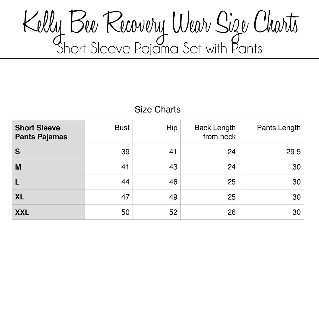 Pre-ordered item may arrive within 7 days . This post mastectomy recovery short sleeve pajama set with shorts includes surgical drain pockets and is an affordable, comfortable way to manage drains post mastectomy, or any other surgery that may require them. They make a wonderful mastectomy gift for someone who has an upcoming surgery. This set includes a short sleeve button down top and pants. The best part is that these pajamas can also be worn after your surgery when you don't need the drains anymore