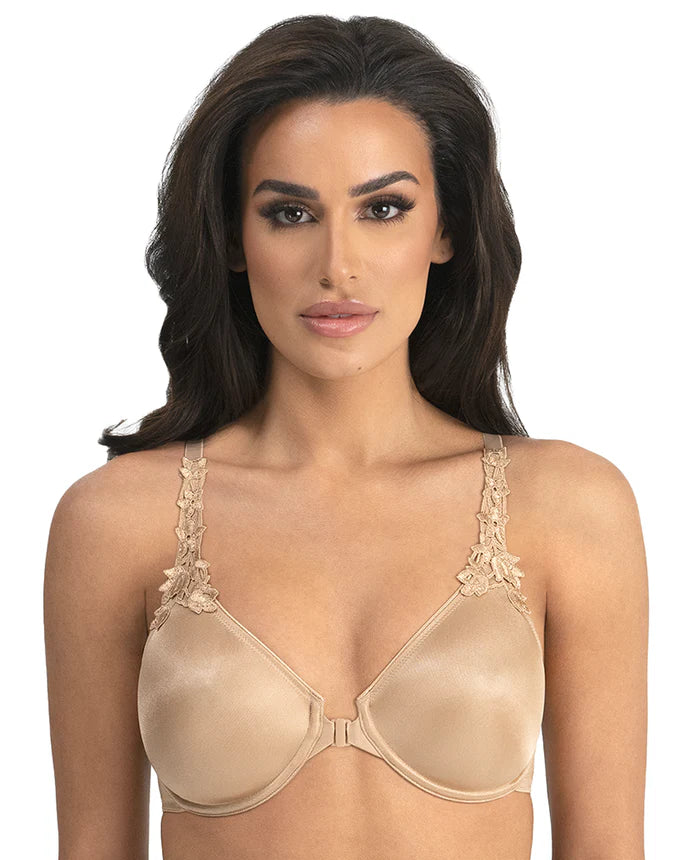 There are front close bras, and there are minimizers. Now the Meryl Front Close Minimizer bra, also a back and side smoother, is truly a unique all in one solution! Slip into your bra conveniently and easily with a unique slide & click front closure. She minimizes, shapes and smooths with a deep front plunge for your lowest cut necklines. Reduce bust line by up to an inch while maintaining and enhancing your natural shape. Ultra comfort & support from plush cushioned underwires and close set straps that prevent slipping and stay comfortably in place. Fully adjustable T-back eliminates bulges and smooths and supports the back and sides. European Guipure lace appliques and fine satin details enhance the luxurious feel.