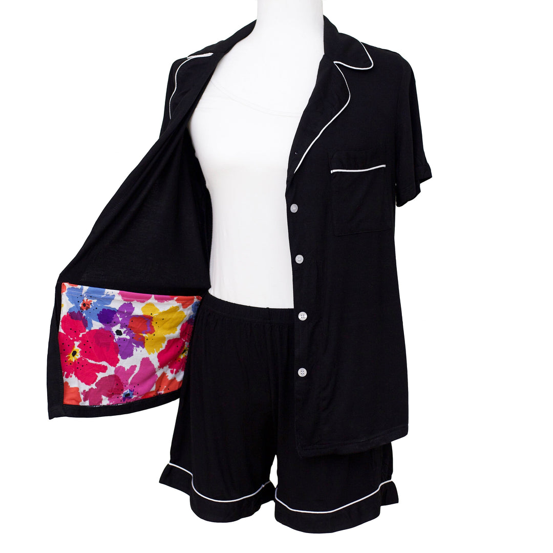Pre-ordered item can arrive within 7 days . This post mastectomy recovery short sleeve pajama set with shorts includes surgical drain pockets and is an affordable, comfortable way to manage drains post mastectomy, or any other surgery that may require them. They make a wonderful mastectomy gift for someone who has an upcoming surgery. This set includes a short sleeve button down top and pants. The best part is that these pajamas can also be worn after your surgery when you don't need the drains anymore