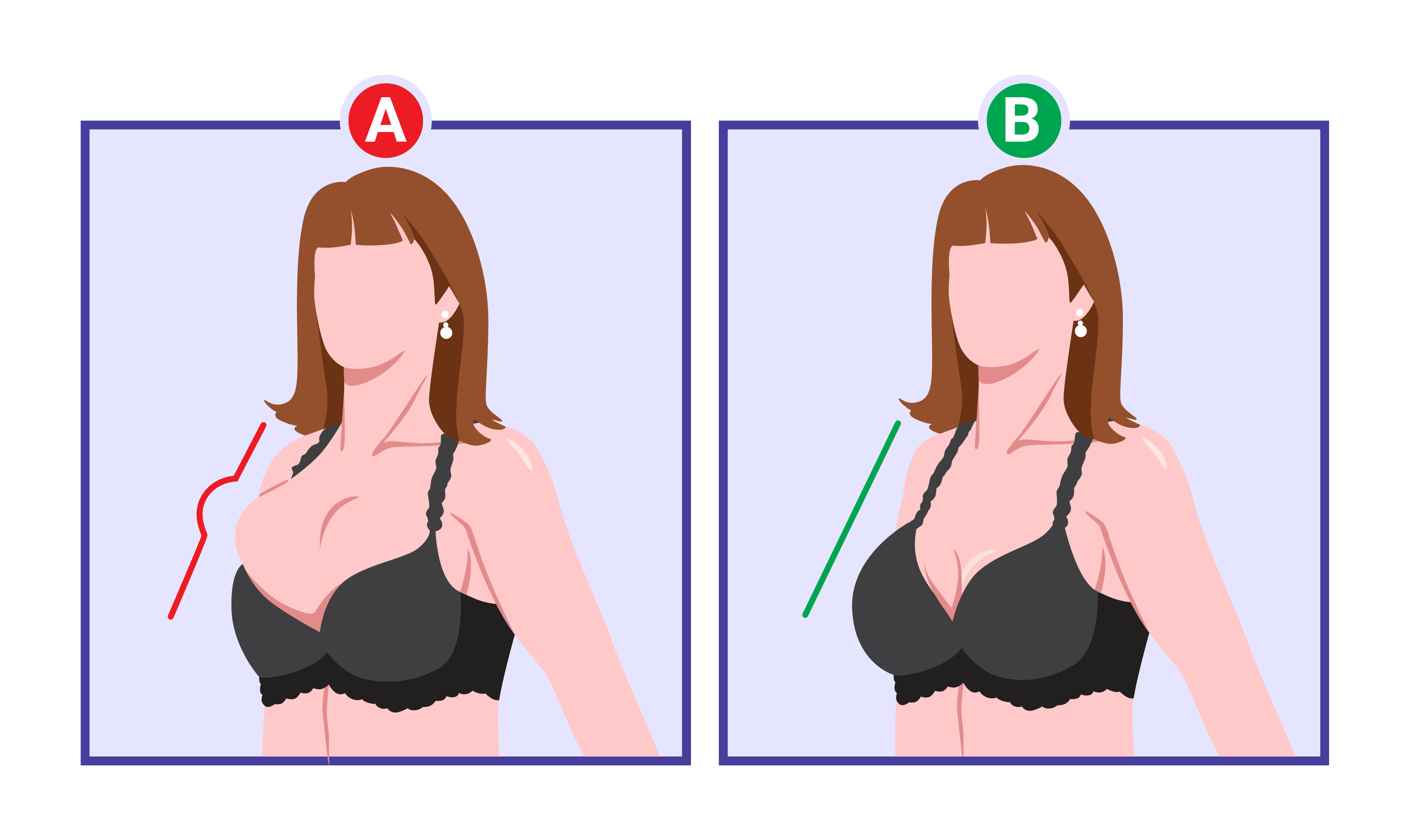 The cup should be comfortable and smooth. Face the mirror at an angle and look at the top edge of your bra.