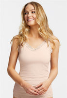 Fleur't's Lace Strap Camisole is the perfect go-to layering piece. Soft and subtle, this cami can be worn underneath most tops, blouses and knits - yet covered enough to be worn on hot summer days and nights. Made of cloud-soft, eco-friendly fabric and edged with 1" delicate stretch lace. Features: •Mid-length hits right below hips • Eco-friendly, cloud-soft TENCEL™ Modal x Eco Soft technology fabric •Curved V-neck and double lace strap for soft, feminine appeal •Built-in “no-show” shelf bra for coverage and support Designed by women.