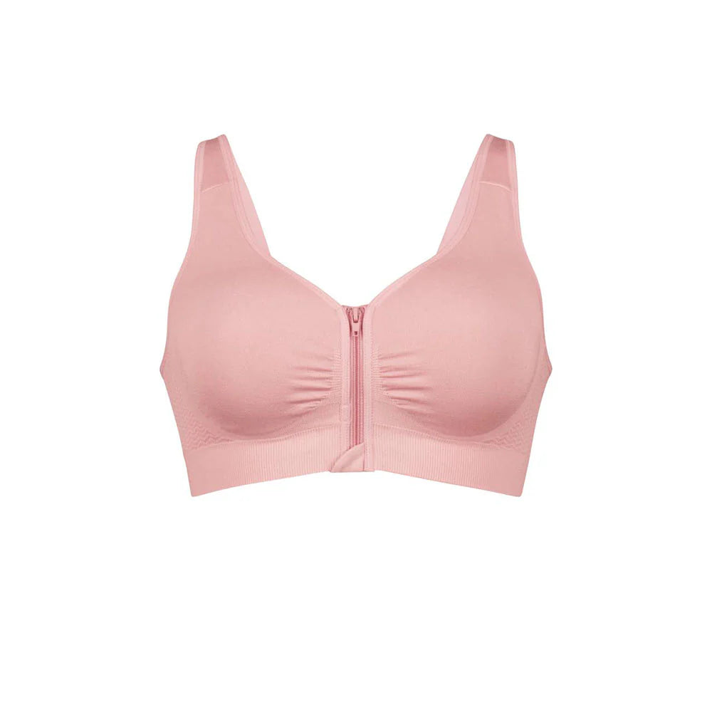 Sporty Look, uncomplicated comfort; This seamless mastectomy crop top opens at the front with a full-length zip-a fashionable eye catcher and very easy to manage. The removable molded pads in the double-layer cups, which conceal, as well as support, and create a natural looking silhouette. Comfortably wide, soft straps, and soft wire-free design round off the “second skin” comfort. Style 5768X