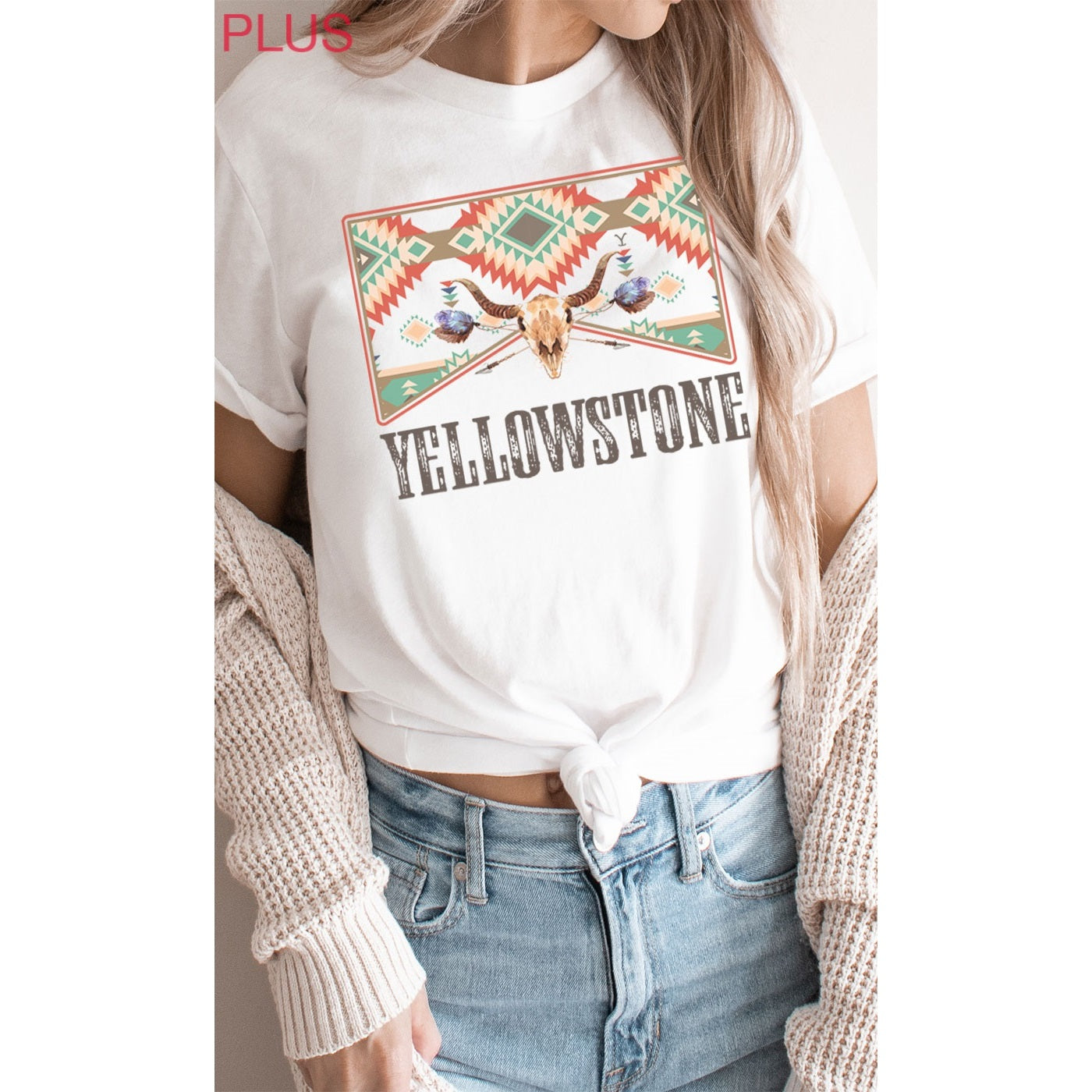 Yellowstone Western PLUS SIZE Graphic Tee. Most t-shirt colors are 52/48 cotton/polyester blend. Athletic Heather & Black Heather are 90/10 cotton/polyester. White, cream, citron, pink, canvas red, lilac, mint are 100% cotton. Ash is 99/1. White, Cream and Citron